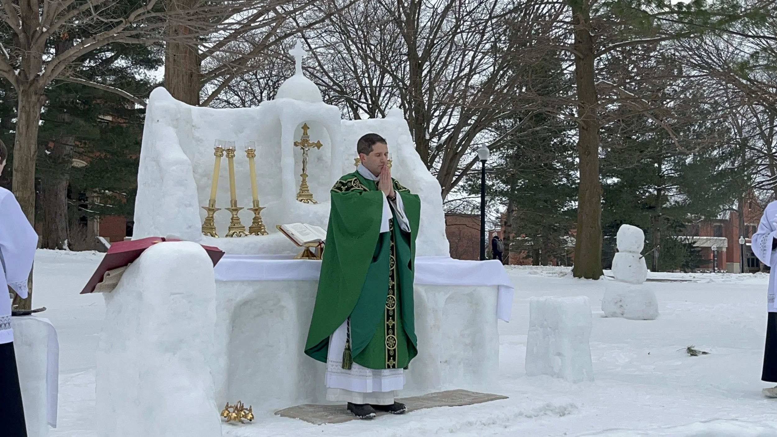 The ice altar has returned! William Hurley (’25) and Andrew Hoeksema (’25) constructed an elaborate altar and other liturgical furnishings so that Fr. Nick could once again celebrate Mass in the frozen Pine Grove. See photos below and read more about the ice altar in an article from The Anchor, Hope College’s student newspaper.
